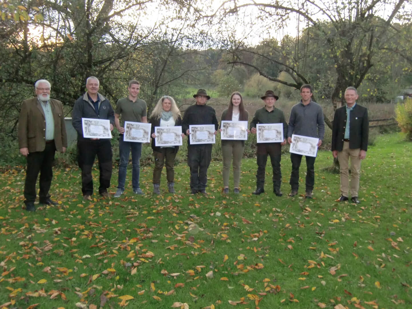 Immerhin konnten nach einem langen Prüfungstag 7 Jungjäger im Kreis von Familien und Freunden ihre Zeugnisse und den Jägerbrief entgegennehmen. Im Anschluss wurden sie zu jagdlichen Klängen der Hüttenbläser zum Jäger geschlagen. Die 3 besten Jungjäger Constantin Hölper, Tobias Rassbach und Jens Altgeld erhielten eine besondere Anerkennung.