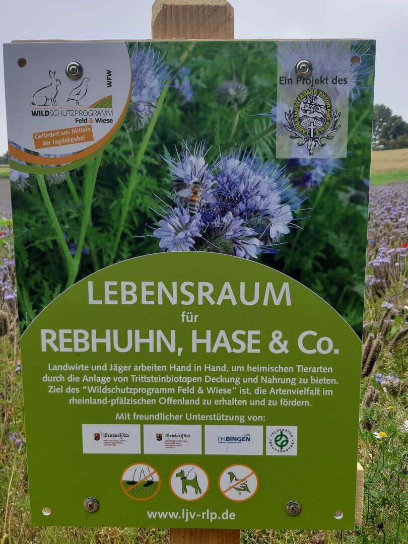 Das vom Landesjagdverband aufgelegte Wildschutzprogramm Feld und Wiese hat sich zum Ziel gesetzt, in strukturarmen Offenlandbereichen Blühflächen für Insekten, Vögel und Niederwild wie Hase, Feldhuhn zu schaffen. Zu diesem Zweck unterstützt die Jägerschaft die Landwirte, indem sie 60% Prozent der Saatgutkosten übernimmt.