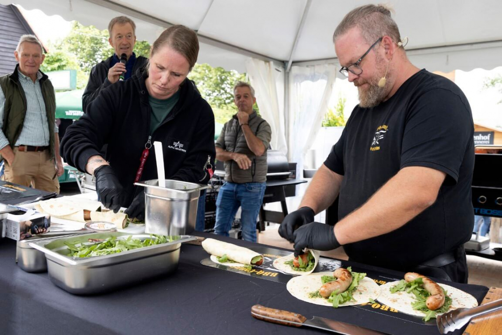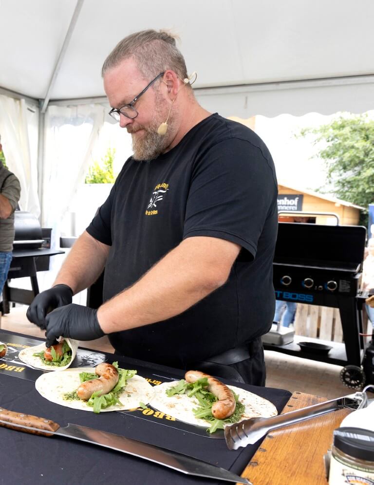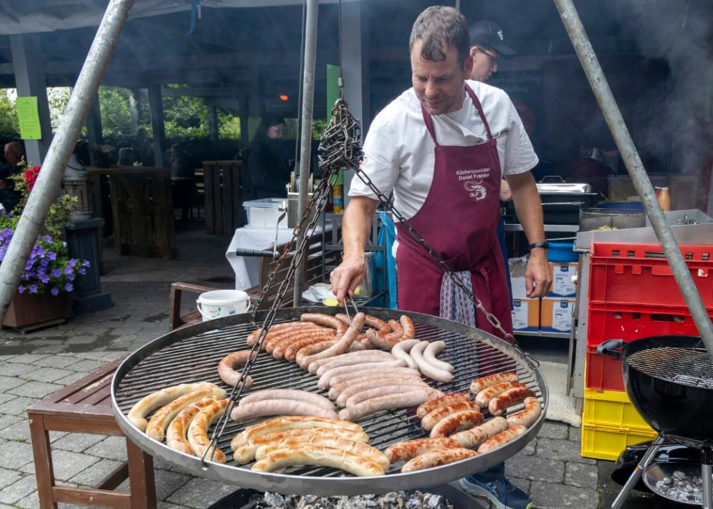Das „Wilde Grillen“ bot neben Genuss auch Freizeitvergnügen für Hunderte Gäste. Neun Jahre ist es schon her, dass die Westerwälder Kreisgruppe des Landesjagdverbandes mit Klaus Skowronek und Hausherr Bernd Schneider zum ersten Mal ein groß angelegtes „Wildes Grillen“ auf dem Dappricher Hof an der Holzbachschlucht bei Seck angeboten haben. Am ersten Sonntag im August war es – zum vierten mal- wieder so weit – und viele Hunderte Gäste wollten sich diese besondere kulinarische Aktion nicht entgehen lassen. Und sie wurden nicht enttäuscht: Es gab jede Menge Kostproben von verschiedenem Wildbret, die von Grillmeister Tobias Kimmel zubereitet und von seiner Assistentin Anne Hess unter die Gäste gebracht wurden. Kenntnisreich und unterhaltsam moderiert wurde das Ganze von Hörfunk- und Fernsehmoderator Martin Seidler. Bei der Zubereitung des Wildbrets, das natürlich aus den Wäller Jagdrevieren stammte, standen die verschiedensten Grillmethoden im Vordergrund, zu denen das Grillen auf Holzkohle wie auch auf dem Gasgrill oder auch die Zubereitung im heißen Rauch des Smokers zählten. Aber es gab auch Erläuterungen zum Dutch Oven, bei dem die Grillkohlen über dem gusseisernen Kochtopf platziert werden und so langsam ein feuriges Chili con (Wildschwein-)Carne garten. Ständig zischte, dampfte, brutzelte es, und ab und zu schlugen auch Flammen aus den Grillgeräten. Schnell zerteilte Tobias Kimmel die prächtigen Fleischstücke und knusprigen Bratwürste in handliche Probierportionen, verfeinerte sie zum Beispiel mit Basilikum und ließ sie von Anne Hess unter die Leute bringen: Die ließen sich die leckeren kostenlosen Proben vom Reh und Wildschwein gerne schmecken. Und das „Wilde Grillen“ war auch ein Fest für alle Sinne, bei dem kulinarischer Genuss auf musikalische Unterhaltung traf: Dafür sorgten der Musikverein Seck und die Jagdhornbläser Hoher Westerwald. An zahlreichen Marktständen im schönen Ambiente des Hofgutes warteten regionalen Produkte auf die Besucher. Da bot zum Beispiel der Bioland-Imker Franz Hastrich seinen Honig in Gläsern oder auch direkt in der Wabe an. Gute Tropfen konnten nicht nur beim Weingut Fauth aus Rheinhessen probiert werden, sondern auch in einer etwas hochprozentigeren Form am Stand der Birkenhof-Brennerei aus Nistertal. Deren Produkte wiederum, den Whisky Fading Hill, nutzte Grillmeister Tobias in Verbindung mit Ahornsirup, um der Wildschweinkeule ein besonderes Aroma zu geben. Oder er kombinierte Gingero, den Ingwer-Creme-Likör vom Birkenhof, mit Honig, um damit die Rehkeule zu aromatisieren. Für die langsam geschmorten Wildbret-Teile mussten sich die Wäller Leckermäuler nur etwas gedulden, bevor sie sie probieren konnten. Aber die Wartezeit konnte man ja zum Beispiel nutzen, um sich an der Erlebnisschule Wald und Wild über heimische Tiere und die Jagd zu informieren. Dort gab es auch jede Menge Broschüren, damit jeder weiß, woher man Wildbret bekommt und wie man es am heimischen Herd oder eben auch auf dem eigenen Grill zubereiten kann. Informationen zur Landschaft warteten am Stand der Touristikerinnen der VG Westerburg auf Besucher. Gleich zwei Messer-Fachleute boten ihre extrascharfen Handwerkszeuge an: Udo Ebach und Christoph Heinz, während Daniela Greis „wilden“ Schmuck präsentierte. Und mit leckeren Waffeln und netten Dekoartikeln wurde das Angebot komplettiert. Wer dann noch nicht genug hatte, konnte noch das Dappricher Hofcafé aufsuchen. Herzlichen Dank an alle, die bei Vorbereitung und Durchführung unterstützt haben. Ein besonderer Dank gilt der Familie Schneider und dem schönen Rahmen des Hofgutes Dapprich.
