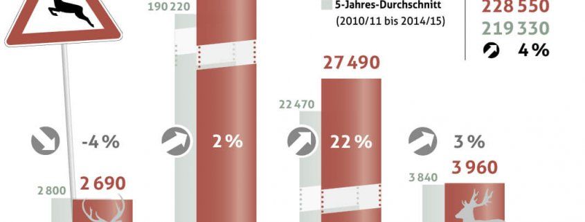 Mit der Zeitumstellung nimmt die Gefahr von Wildunfällen über Nacht rapide zu. Jetzt ist besonders im ländlichen Straßenverkehr Vorsicht geboten. Die aktuelle DJV-Statistik zeigt: Wildunfälle nehmen leicht zu. Rehe verursachen über 90 Prozent der Kollisionen.